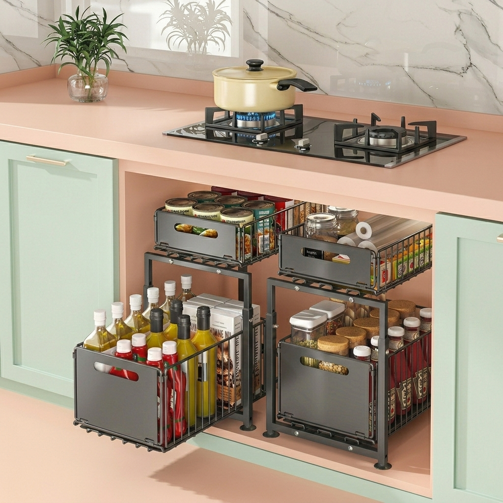 Maximize cabinet space with this 2-tier pull-out cabinet organizer. Featuring adjustable height and smooth sliding drawers, it’s perfect for kitchen cabinets, under-sink storage, and pantry organization.